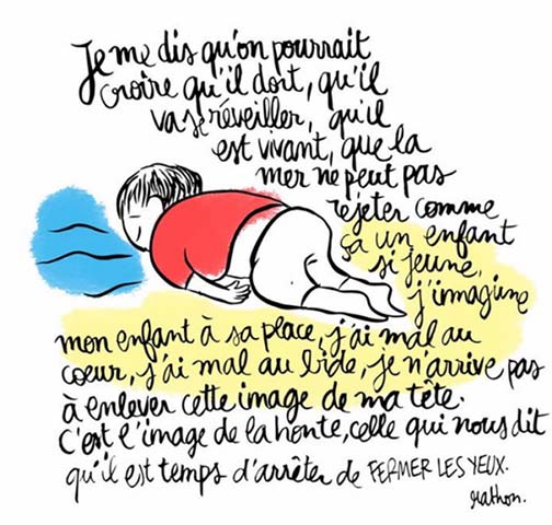 2 Eylül 2015 Çarşamba günü Bodrum sahilinde 3 yaşındaki Suriyeli mülteci Aylan Kurdi’nin cesedi bulundu. Onun cansız bedeninin görüntüleri üzerine dünyanın dört bir yanından sanatçılar yaptığı çalışmalarla tepkilerini gösterdiler… Hiçbir çocuğun ölümü bu şekilde olmamalıdır…