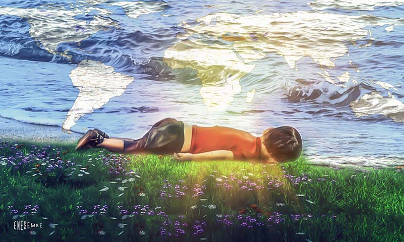 2 Eylül 2015 Çarşamba günü Bodrum sahilinde 3 yaşındaki Suriyeli mülteci Aylan Kurdi’nin cesedi bulundu. Onun cansız bedeninin görüntüleri üzerine dünyanın dört bir yanından sanatçılar yaptığı çalışmalarla tepkilerini gösterdiler… Hiçbir çocuğun ölümü bu şekilde olmamalıdır…