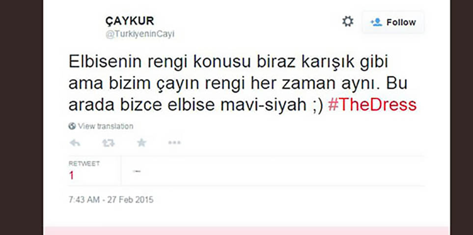 Elbisenin “mavi-siyah” mı yoksa “beyaz-altın sarısı” mı olduğu ile ilgili süren tartışma bir anda tüm dünyaya yayıldı ve milyonlarca insan #thedress hashtag’i ile fikrini paylaşmaya başladı. Tüm dünyada bir anda trend topic olan bu tartışmanın yarattığı fırsatı kaçırmayan markalar da birbirinden esprili Tweet’lerle seslerini duyurdu. Markalar için, gerçek zamanlı pazarlama imkanı sunan Twitter’daki bu anlık dalgalar, markaların binlerce kez Retweet edilen Tweet’lerle kendilerinden söz edilmesini sağlıyor.