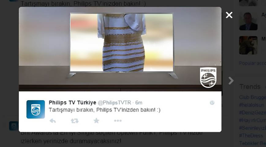 Elbisenin “mavi-siyah” mı yoksa “beyaz-altın sarısı” mı olduğu ile ilgili süren tartışma bir anda tüm dünyaya yayıldı ve milyonlarca insan #thedress hashtag’i ile fikrini paylaşmaya başladı. Tüm dünyada bir anda trend topic olan bu tartışmanın yarattığı fırsatı kaçırmayan markalar da birbirinden esprili Tweet’lerle seslerini duyurdu. Markalar için, gerçek zamanlı pazarlama imkanı sunan Twitter’daki bu anlık dalgalar, markaların binlerce kez Retweet edilen Tweet’lerle kendilerinden söz edilmesini sağlıyor.
