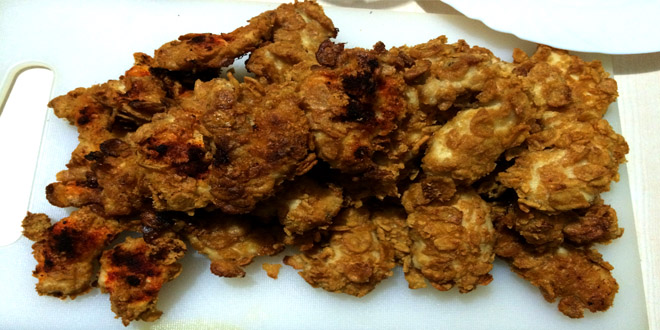 - Unlanmış tavuk göğüslerini ilk önce kremalı sosa daha sonra ufalanmış mısır gevreğini ile kaplayınız.