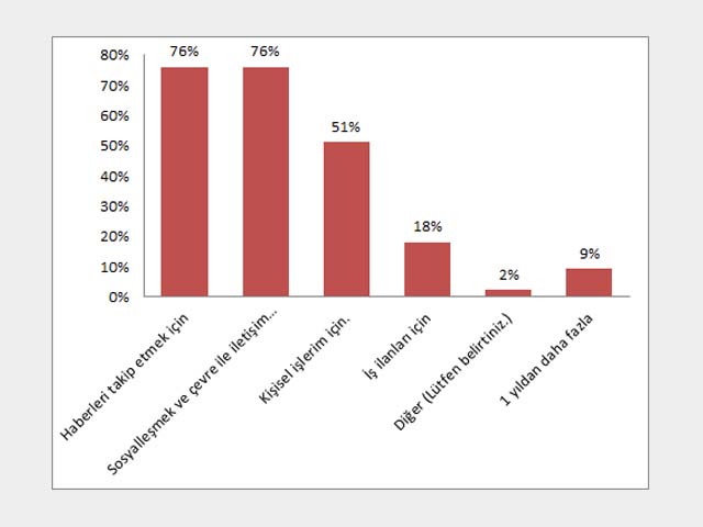 Tüm sosyoekonomik segmentleri kapsayan ve 8369 kişinin katıldığı internet üzerinden yapılan araştırma sonuçlarına göre, katılımcıların yüzde 72’si internete bağlanmak için ADSL bağlantısı kullanırken, yüzde 63’ü 3G kullanıyor. Fiber optik hat kullananların oranı ise yüzde 16 şeklinde ölçümleniyor. İnternete her gün girmeyenlerin oranı ise yalnızca yüzde 2 olarak araştırma sonuçlarına yansırken, internete girmek için bilgisayar ve cep telefonu haricinde bir cihaz kullananların oranı yüzde 19’u buluyor.