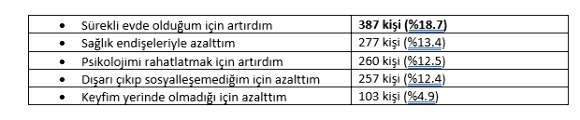 • Toplam yanıtlarda içki tüketiminde azalma eğilimi görülse de “Sürekli evde olduğum için içki tüketimim arttı” diyenler en büyük dilimi oluşturdu• Sağlık nedenleriyle tüketiminin azaldığını belirten kesimin büyüklüğü bilinçli bir içki tüketimine işaret etmektedir.